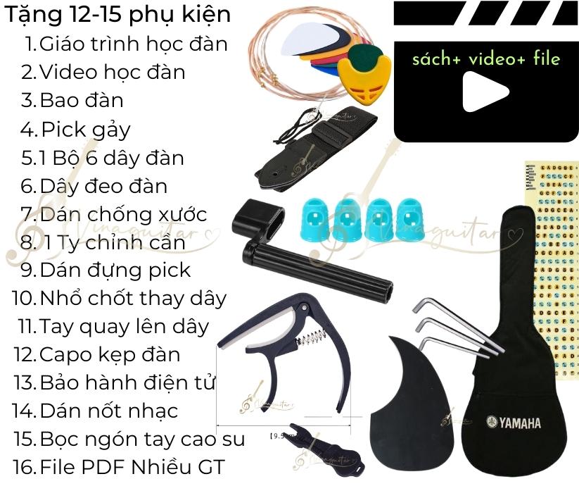Giá 650k tặng 12 phụ kiện, bao vải, 550 tặng 1 pick gảy, dây lẻ. 730k tặng full 12 phụ kiện, bao da